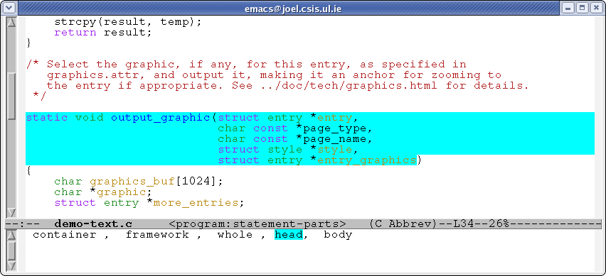 The up and down arrows now move us between successive statements, while the left and right arrows move between parts of the same statement. When you switch to different parts, a reminder of what the parts are, and which one is current, is displayed in the echo area. Here, we have selected the head of a function definition.